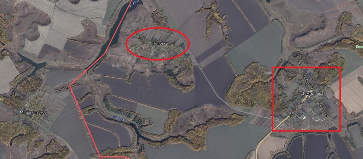 Прямоугольник - Демидовка, овал – Поповка. Обе деревеньки совсем близко к границе, Поповка так совсем на границе. Обе деревеньки совсем маленькие, улица-две и рядом с обеими есть лесополосы, где можно укрыться противнику, чем он и пользуется. А напротив границы также есть вполне себе большие лесные массивы откуда неприятель и совершает вылазки на нашу территорию. Сейчас они залетают к нам на квадроциклах и другой мототехнике, затем спешиваются и пытаются закрепиться, либо переходят малыми группами по 2-3 человека.