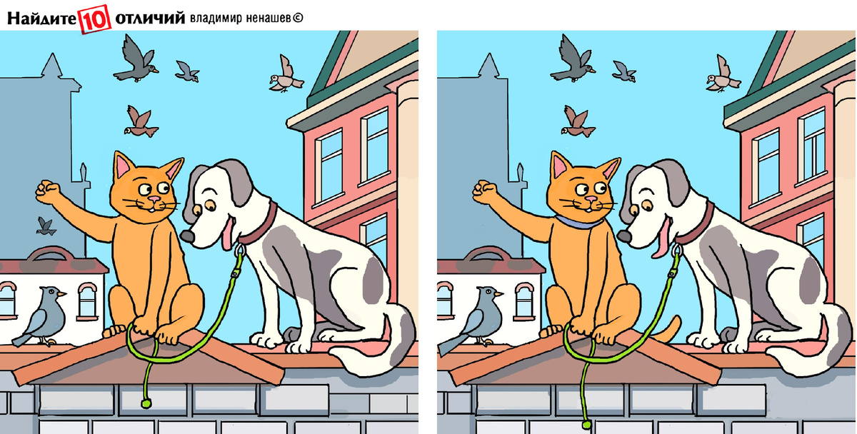 Друзья, сегодня у нас в загадке есть кот и пёс. Они на крыше дома своего любуются окружающим миром. Надо попробовать найти 10 отличий и еще разницу в цвете, для тех, кто захочет. Полезный для всех тест.