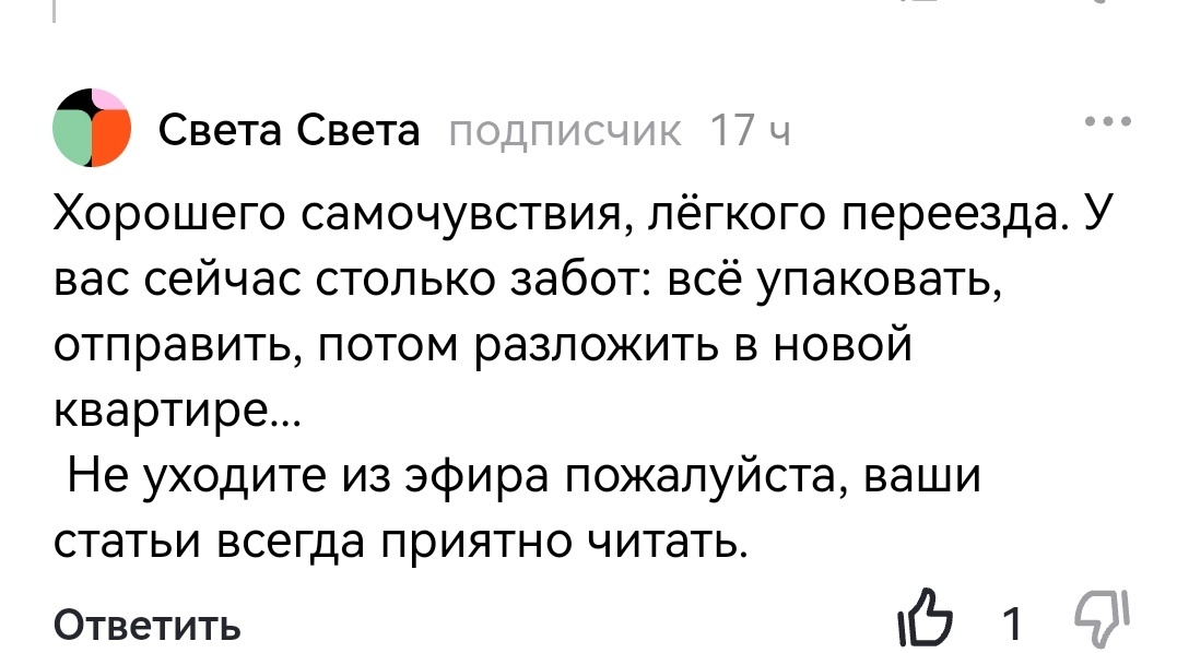 Дорогие друзья, как же я могу оставить вас, и быть без своего присутствия в эфире? Разумеется, это невозможно.🤷 Можно писать небольшие статьи. Благодарю вас за ваши отзывы.❤ Спасибо за ваши пожелания легкого переезда! 😊 😘 К моей статье «Коротко о главном» вы задали мне вопросы, и я постараюсь дать на них краткие ответы. Ещё одно важное событие в нашей жизни — мы с мужем готовимся к переезду с Крайнего севера в Санкт-Петербург. Мы купили новую квартиру и обустроили её в 2024 году, и теперь будем жить ближе к нашему сыну (в одном ЖК). Аля права, моему мужу надо было доработать до пенсии, но мы решили, что он продолжит работать в Санкт-Петербурге. Сейчас ему 54 года, и до пенсии ему осталось 6 лет. У него есть северный стаж и пенсионные баллы, и он сможет выйти на пенсию в 60 лет. Однако мы поняли, что не хотим больше жить на севере, а хочется пожить в Санкт-Петербурге в своей новой квартире. Я вышла на заслуженный отдых в августе 2024 года, в 53 года (пенсия в переходный пери