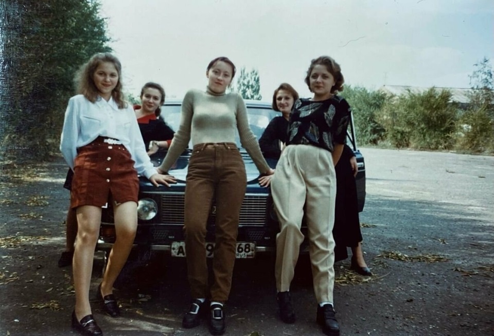 Пять подруг собрались у старой кирпичной стены с граффити "90-е", словно готовясь к съемке клипа в стиле ретро. Их образы — это ода моде той эпохи: от ярко-красных блузок и кожаных юбок до джинсовых курток и высоких каблуков. Одна из них в длинном синем пальто с сумкой через плечо выглядит как рок-звезда, другая в сетчатых колготках и красных туфлях добавляет дерзости. Они позируют с уверенностью, опираясь на деревянную дверь, будто это их сцена, а за углом их, возможно, ждёт шумная вечеринка, где будут звучать хиты 90-х. Атмосфера фото пропитана свободой и бунтарским духом той незабываемой эпохи.