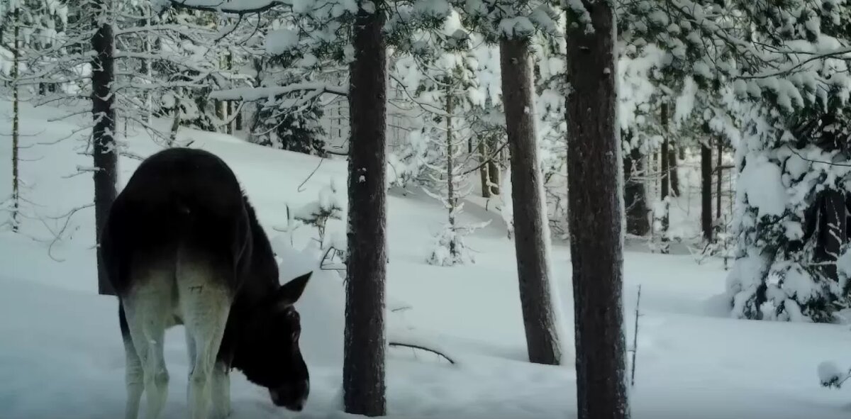 Фотоловушка сняла на видео молодого лося в Лапландском заповеднике. Сохатый прогуливался по лесу и что-то искал в снегу.