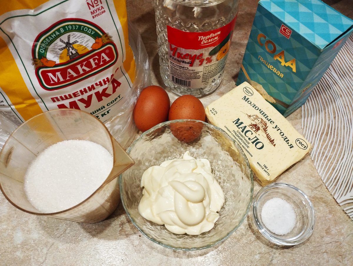 Приветствую вас на своем канале! Сегодня мы будем готовить печенье по рецепту, который был любим в детстве. Это песочное печенье получается очень вкусным. Итак, приступим! Мука-600гр Майонез 4 ст.л ( можно использовать сметану) Сода 1/2 ч.л гашеная в уксусе Сливочное масло 100г Яйцо 2шт Сахар 200гр Соль 1 щепотка В глубокую миску добавляем сахар и яйца. Хорошо перемешиваем затем добавляем растопленное сливочное масло, обратите внимание что масло не должно быть горячим иначе яйца прихватятся Следом добавляем соду гашеную уксусом Теперь добавляем майонез и перемешиваем. Осталось добавить муку и вымесить тесто Тесто вымешиваем руками, оно должно получиться крутое Тесто готово Теперь из теста делаем шарики потом расплющиваем их и выкладываем на противень предварительно постелив пергамент. Отправляем будущую вкуснятину в духовку про 180 градусах на 10 минут. Домашнее печенье готово! Непременно попробуйте приготовить его самостоятельно — это не займёт много времени, а удовольствие от проц