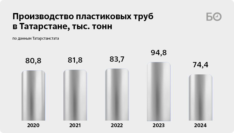 В РТ падение производства пластиковых труб оказалось куда более глубоким. По данным Татарстанстата за 2023 год, в республике работало 137 предприятий по выпуску пластиковых труб и фитингов, которые совокупно производили почти 95 тыс. т пластиковых труб, или 8% от российского производства. Однако в 2024-м после многолетнего стабильного роста в трубном секторе было зафиксировано падение производства, причем сразу на 24% до 74,4 тыс. тонн. Сократилось и число производящих трубы предприятий — до 127 компаний.