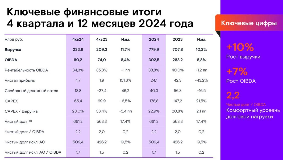 Российский рынок переживает период повышенной волатильности на фоне геополитических событий и публикации корпоративной отчетности. Сегодня в фокусе внимания - результаты «Ростелекома» за 2024 год. Разберем ключевые тренды и их последствия для инвесторов. Итак, выручка компании за отчетный период выросла на 10% до 780 млрд руб. При этом чистая прибыль сократилась на 43% до 24 ярдов. Основная причина - рост долга и расходов на его обслуживание. Телекоммуникационный сектор всегда был более уязвим в период жесткой монетарной политики ввиду его закредитованности. Разберемся подробнее. Финансовые расходы компании выросли на 68% г/г - до 86 млрд руб. Это составляет около двух третей от операционной прибыли (124 млрд руб., +4% г/г), что существенно ограничивает маржинальность. Кредиты и займы на 31 декабря составили 570 млрд (+17% г/г). На расходы по процентам ушло 70 млрд. При грубом расчете средняя ставка варьируется от 12,3% до 14,8%. Причина относительно низкой ставки - наличие «старых» кр