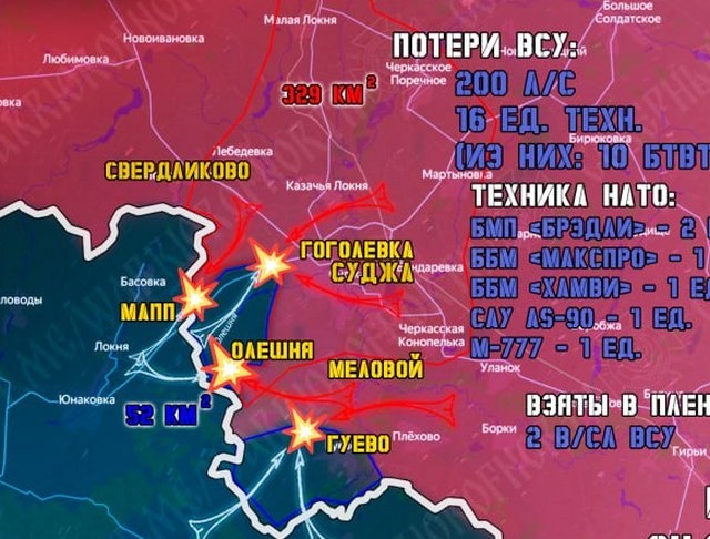Общее продвижение Северян в Курской области превысило 2,9 километра. Под контролем ВСУ, по информации наших военных, остается 52 квадратных километра территории Курской области.