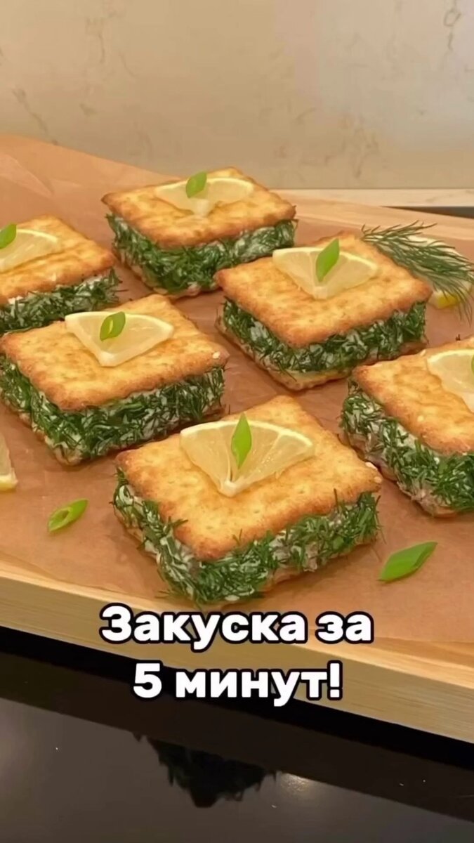 За 5–7 минут мы создадим аппетитное и привлекательное угощение для праздничного стола! Никаких сложных процессов приготовления! Нам понадобится: 150г слабосолёнлй рыбы (семга, форель, нерка), 1 свежий огурец, 150г творожного сыра, укроп, крекеры (простые, зерновые, соленые или сырные на ваш вкус). Рыбу и огурец мелко порезать, смешать с сыром, выложит на крекере. Придавить вторым крекером и по бокам обвалять в укропе. Подать украсив лимоном. Блюдо получается не только красивым, но и очень вкусным! Мы предлагаем вам попробовать наше фирменное сочетание ингредиентов, которое обычно используется в суши-роллах, но теперь оно представлено в виде крекеров. Это блюдо готовится быстро и легко, но при этом оно выглядит ярко и аппетитно, что делает его идеальным украшением любого праздничного стола. Мы будем рады, если вы попробуете наше блюдо и поделитесь своими впечатлениями. Спасибо за ваши лайки и комментарии!❤ Приятного аппетита! Наслаждайтесь вкусом!