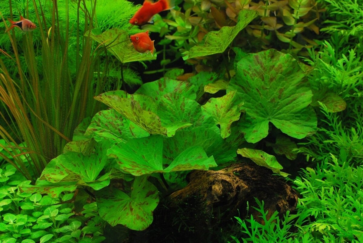 Водяная лилия тигровая, или кувшинка (Nymphaea lotus), происхождение которой не определено точно (в некоторых источниках указывается на Западную Африку), считается одной из самых прекрасных водных растений. Ее ценят не только за великолепные цветы, но и за прекрасную окраску подводных листьев, усыпанных коричневыми пятнышками. Плавающие листья имеют почти гладкую зеленую или оливковую окраску. В культуре встречаются две формы этого растения: с красными и зелеными подводными листьями. Первая форма обладает выраженной красной окраской подводных листьев. Для успешного выращивания водяной лилии тигровой рекомендуется использовать аквариумы со столбом воды не более 45 см и обеспечить большую плоскость поверхности воды. Зимой рост этого растения замедляется, и оно практически не формирует плавающих листьев. Выращивание нимфеи требует тропического аквариума с оптимальной температурой 24-28 °C. При температуре ниже 22 °C рост резко замедляется, и цветение практически не происходит. Ва