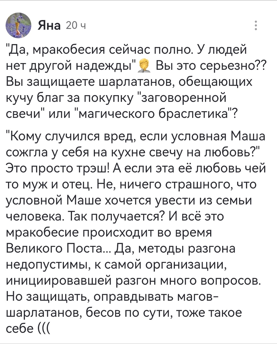 А персонально автору хочу пожелать, чтобы к подобного рода магам и эзотерикам, а попросту мошенникам, применялись бы такие же меры борьбы, как к инфоцыганам.