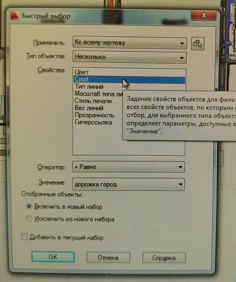 Действия выполняю в программе Автокад 2014. Для выбора всех объектов 1 слоя требуется ввести команду QSELECT В появившемся окне требуется выбрать слой. Ниже как на фото - значения - имя слоя который требуется. Оператор - равно. Потом поставить галочку в строке - добавить в текущий набор. Ок Все объекты слоя будут выделены и выбраны.