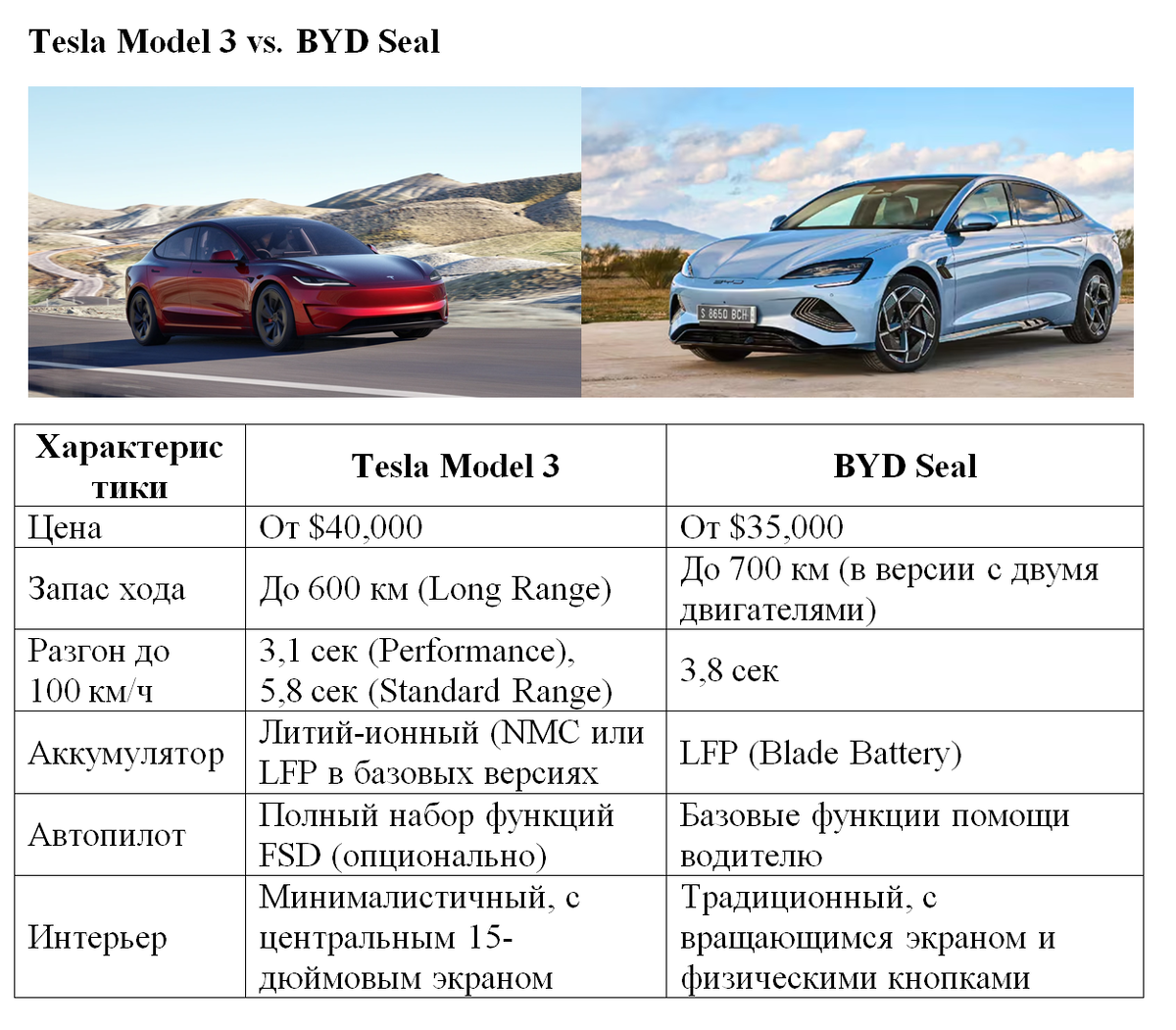 Электрокар BYD Seal, представленный в 2022 году, позиционируется как прямой конкурент Tesla Model 3. Оба автомобиля предлагают схожие характеристики: запас хода около 500 км, разгон до 100 км/ч за 3-4 секунды и современный дизайн. Однако китайская сторона выигрывает в цене, предлагая аналогичные технологии за меньшие деньги.