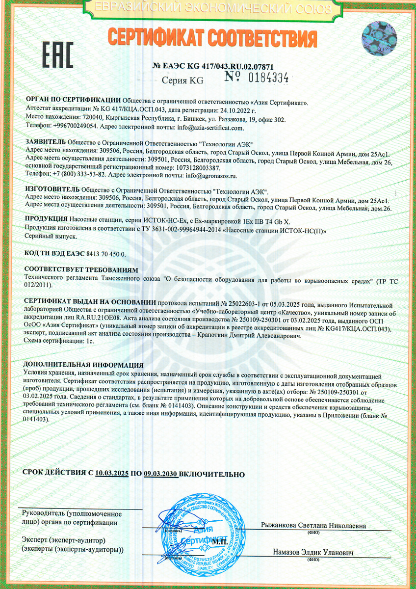 Рады сообщить нашим партнерам, что наша компания, Технологии АЭК, недавно получила сертификат на изготовление насосных станций во взрывозащищенном исполнении. Этот важный шаг подтверждает наши высокие стандарты качества и безопасности продукции и открывает новые возможности для её применения в потенциально опасных условиях.