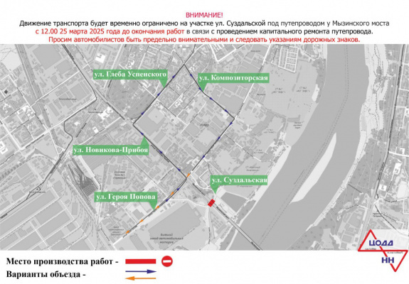 В Нижнем Новгороде временно закрыли проезд по улице Суздальской под путепроводом у Мызинского моста