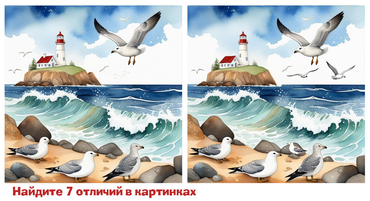Как говорят моряки: "Только внимательный капитан заметит рифы, пока не поздно." На берегу шумного моря чайки собрались на утренний совет. Волны бьются о скалы, а маяк, как всегда, стоит на страже. Но что-то не так… То ли одна из чаек потеряла клюв, то ли волны перепутали камни? А может, маяк поменял цвет? Всё кажется на месте, но детали разбегаются. Найди 7 отличий и верни порядок на морском берегу! Горизонтальный тест на внимательность в картинках: Вертикальные картинки с тестом на внимательность: Тебя не обманешь – всё разглядела, как опытный капитан. Разберись с фрагментами и пусть день будет спокойным, как море в штиль. До встречи!