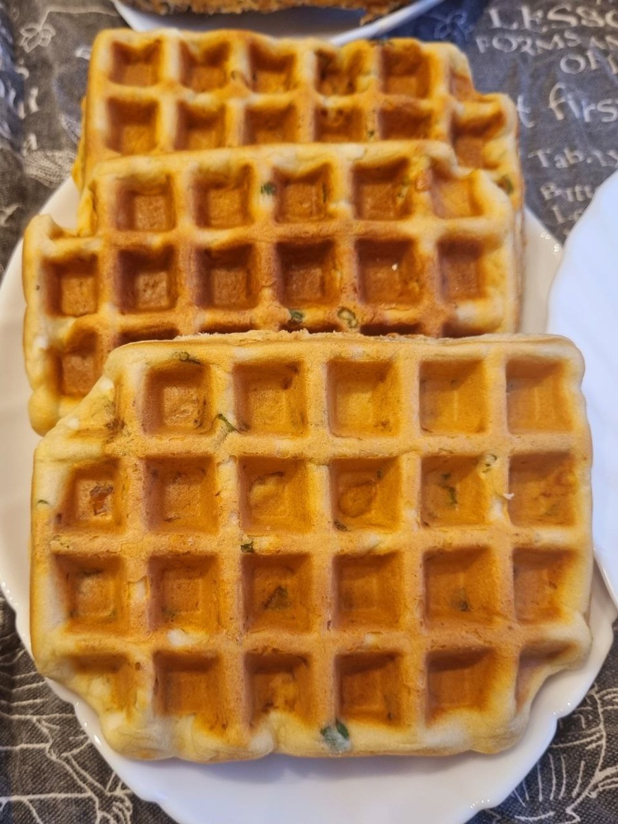 Сначала готовим тесто. Потом в тесто добавляем яйца и лук, все смешиваем, выпекаем вафли в вафельнице.