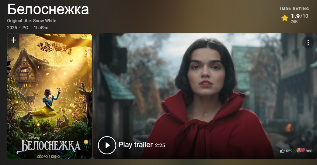 Однако "Белоснежка" приобрела стигму проекта "воук" культуры и вышла в прокат в самый неудачный момент - в 2025 году, когда ветер дует уже совсем в другую сторону. Очевидно, что если бы эта же самая лента вышла в 2019 г., она легко заработала бы миллиард долларов и получила всеобщие восторги от кинокритиков и СМИ.