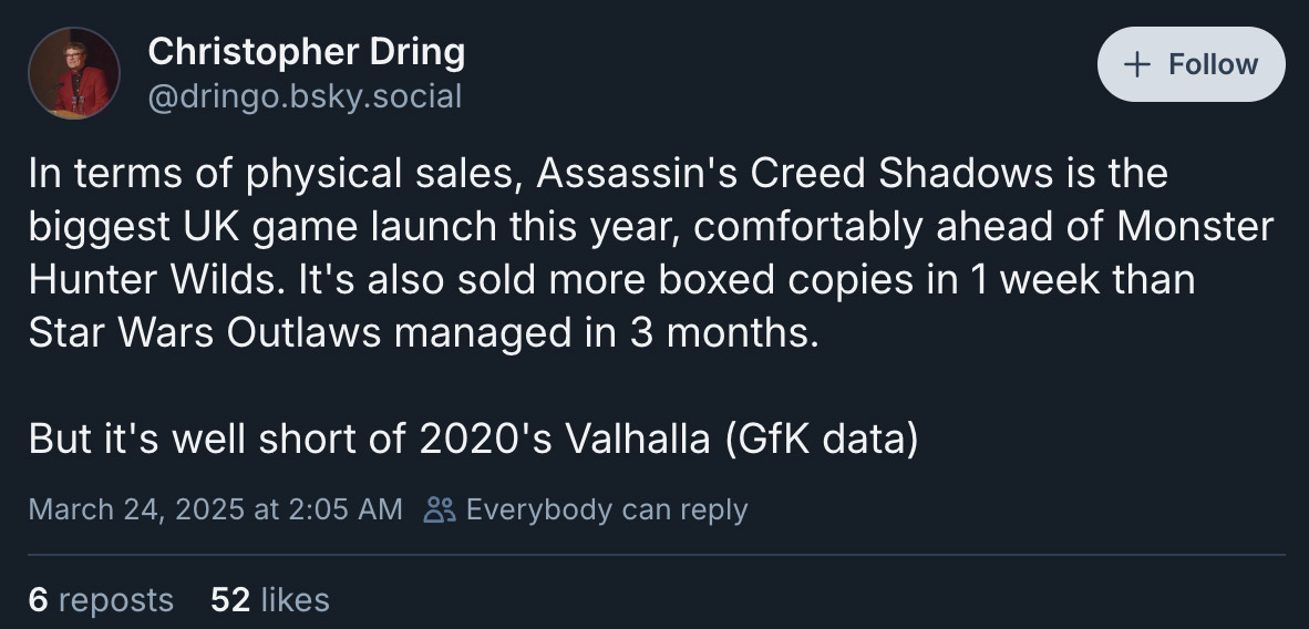 Аналитик Кристофер Дринг поделился предварительными данными о результатах Shadows, и они выглядят очень впечатляюще для новой игры серии Assassin's Creed. Главный вывод из заметок Дринга — за первые три дня Shadows продала больше физических копий, чем Star Wars Outlaws удалось реализовать за первые три месяца.