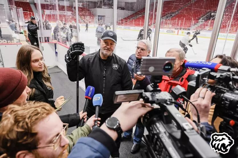 По окончании занятия к собравшимся журналистам по очереди подошли главный тренер Бенуа Гру, нападающий Александр Кадейкин и капитан Владимир Ткачев.