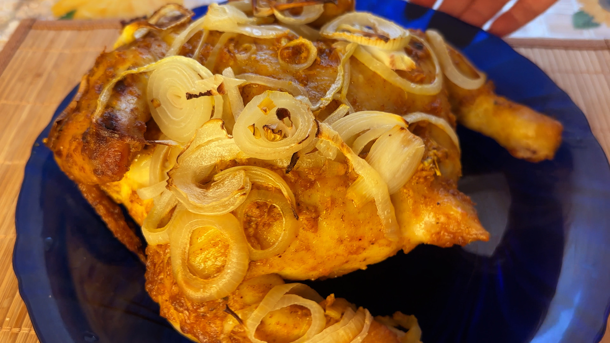 Привет, Друзья! Сейчас я расскажу, как приготовить очень вкусную курочку на хлебе и луке. Здесь получится вкусным и сочным всё - и курочка, и хлеб, и лук. Нам понадобятся: В форму, в которой будем запекать курицу добавляем растительное масло и равномерно распределяем Выкладываем хлеб в хаотичном порядке Нарезаем колечками лук И выкладываем часть лука сверху хлеба Разрезаем курицу в районе грудки и вычищаем внутренности Натираем на терке чеснок Добавляем в чесночную смесь приправу для курицы (2 ч ложки) и по 1 чайной ложке паприки и куркумы Добавляем майонез или сметанный соус (примерно 4 столовые ложки) И все тщательно перемешиваем Теперь этой смесью натираем курицу со всех сторон Курицу выкладываем сверху лука на противень И убираем в духовку на 20 минут Достаем курицу из духовки, переворачиваем её И снова убираем в духовку на 20 минут Вытаскиваем курицу, переворачиваем курицу и укладываем сверху оставшийся лук Опять убираем в духовку примерно на 20 минут или до тех пор, пока лук не п