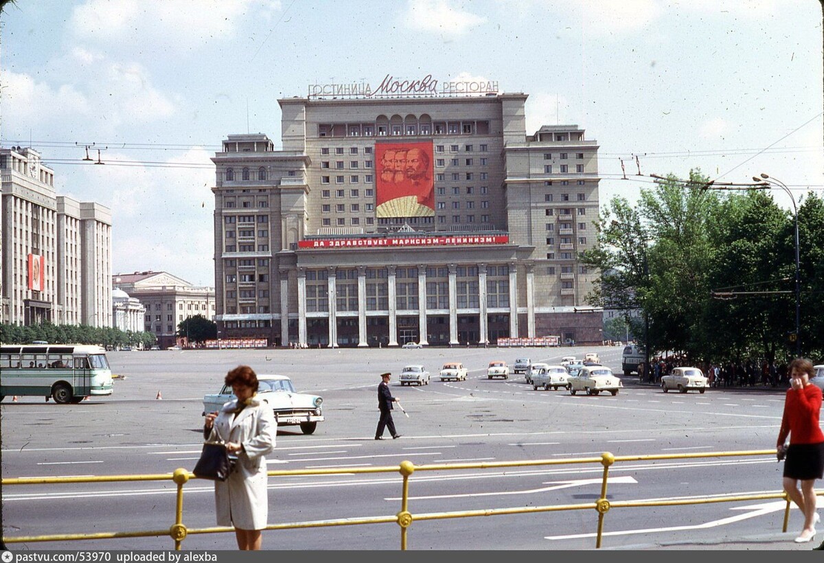 Давайте совершим очередное путешествие сквозь время, прогуляемся по улицам столицы, посмотрим, какой была жизнь в шестидесятых и что изменилось за прошедшие десятилетия. Поехали! ... На фото вид от здания Манежа на площадь 50-летия Октября. Справа Александровский сад, впереди гостиница "Москва", а слева здание Госплана СССР. Фото 1969 года Вид с этой точки за прошедшие шестьдесят лет заметно изменился. В девяностых площади вернули название - Манежная, а потом построили на ней подземный ТЦ, сверху же обустроили пешеходное пространство. Гостиница "Москва" хоть и похожа, но это полноразмерная условно похожая копия, которую построили в конце двухтысячных годов. А в здании Госплана сейчас заседают слуги народа Это вид от музея Ленина на площадь 50-летия Октябр / Манежную в день празднования очередного Первомая. На заднем плане гостиницы "Националь" и недавно достроенная "Интурист". Фото 1969 года Гостиницу "Интурист" тоже снесли в двухтысячных, но на её месте не стали копию возводить, а пос