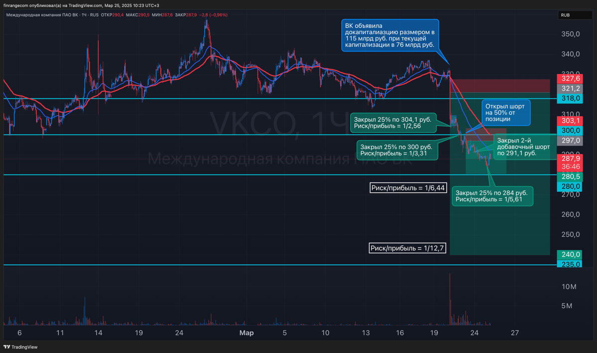 Хотите увеличить доходность портфеля и зарабатывать больше на бирже? Один из ключевых навыков — умение тянуть сделку и высиживать прибыль. Крупные движения случаются гораздо реже, чем короткие импульсы, но именно они приносят основную прибыль трейдерам. Если не получается удерживать весь объём позиции, фиксируйте прибыль частями по мере движения котировок. В условиях зависимого от геополитики рынка этот подход особенно актуален. Для примера, недавно я открыл шорт в акциях ВК после провального отчёта и докапитализации компании по 321 руб. Понимая, что впереди заседание ЦБ и переговоры, я не был готов держать всю позицию, но фиксировал прибыль частями. В итоге в спекулятивном портфеле оставалась лишь 1/4 позиции, утром на открытии рынка зафиксировал ещё 25% от позиции по 280 руб. Когда рынок трендовый, лучше использовать следующий. Закрываете 90% позиции по достижению цели или соотношению риск к прибыли 1 к 3, остальные 10% держите, перетаскивая стоп-лосс в безубыток после каждого обновл