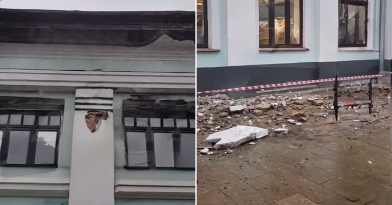 Как пишет паблик, обрушение фасада произошло около 6 утра. Причина неизвестна. На месте сейчас работают ремонтные службы.
