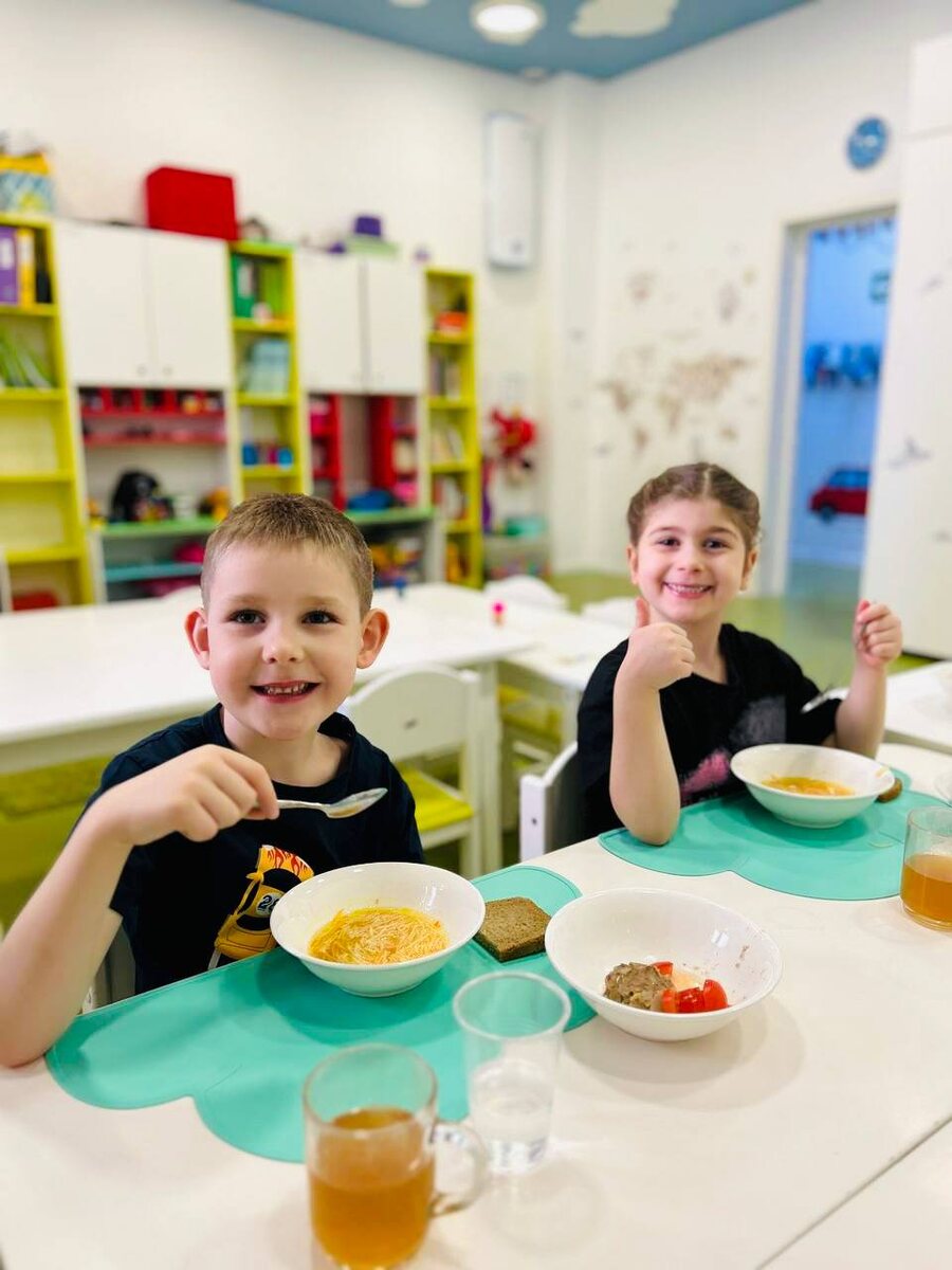 Наше меню разработал детский диетолог, согласно всем требованиям к питанию дошкольников. Кроме того, мы используем сезонные фрукты и овощи, включая их в салаты, перекусы и компоты, давая ребятам самые свежие продукты и делая их рацион разнообразным. У нас в меню нет жареных и жирных продуктов — мясо и рыбу готовим на пару, бульоны делаем золотистыми и легкими, гарниры вкусными и без соусов.