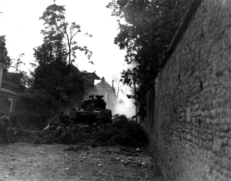 Канадский танк М4 «Шерман» американского производства с бортовым номером 14 из состава полка «Фузилеры Шербрука» (Sherbrooke Fusiliers) и поддерживающая его пехота из полка «Фузилеры Мон-Руаяля» (Les Fusiliers Mont-Royal) ведут бой на улице французского города Фалез с боевой группой штурмбаннфюрера СС Краузе (Kampfgruppe Krause)которая в свою очередь представляла 12-ю танковую дивизию СС «Гитлерюгенд» (12. SS-Panzer-Division Hitlerjugend)