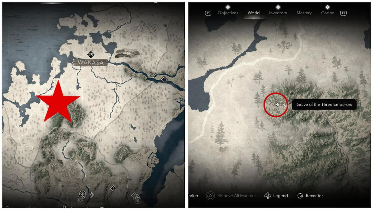 Одеяние "Последний танец Онре" можно обнаружить в провинции Вакаса, в локации Могила трех императоров. Эта область расположена между Разбитым берегом и Перевалом Онью. Если вы только начали прохождение Assassin's Creed Shadows, рекомендуется отложить посещение этого места на потом из-за высокого уровня сложности противников (29 уровень). Впрочем, в самой Могиле трех императоров враги отсутствуют, что упрощает задачу даже для низкоуровневых персонажей.