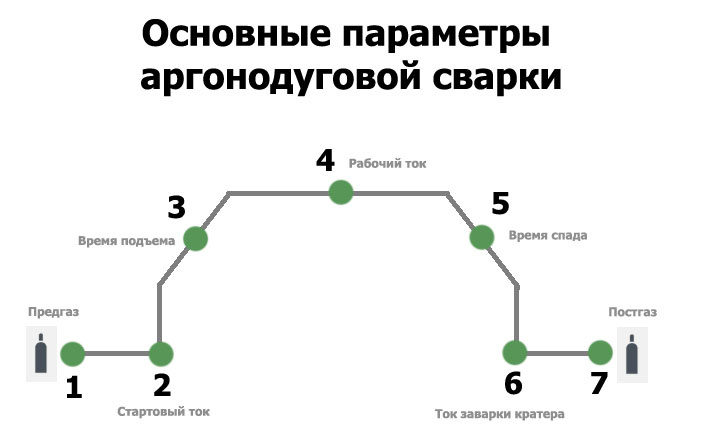 На лицевой панели TIG аппаратов, как правило, присутствует циклограмма - наглядный вариант цикла сварки с настройкой параметров на каждом ее этапе. Итак, идем по циклу сварки (по циклограмме) и разбираем какой параметр для чего.