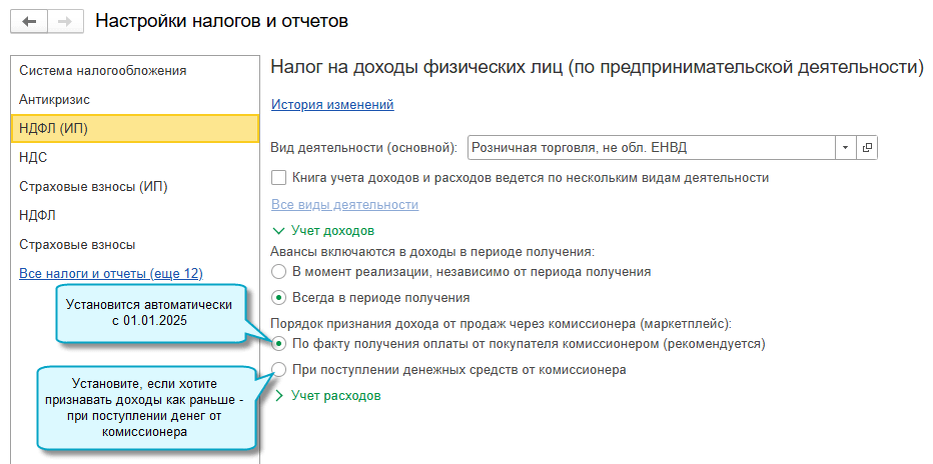 В программе «1С:Бухгалтерия 8» начиная с версии 3.0.171 добавлена возможность выбрать порядок признания дохода от продаж через комиссионера (маркетплейс) для ИП, уплачивающих НДФЛ по доходам от предпринимательской деятельности. Доступны два варианта: Простой интерфейс: меню «Организация – Налоги и отчеты». Полный интерфейс: меню «Главное – Настройки – Налоги и отчеты». Если с 01.01.2025 применяете новый порядок признания дохода – по факту получения оплаты от покупателя комиссионером, то: Рекомендуется перепровести документы с начала 2025 года. Простой интерфейс: меню «Товары – Маркетплейсы – Отчет о продажах (розничные продажи)». Полный интерфейс: меню «Продажи – Продажи – Маркетплейсы и комиссионеры – Отчет о продажах (розничные продажи)». Полный интерфейс: меню «Продажи – Продажи – Маркетплейсы и комиссионеры – Отчет о продажах (оптовые продажи)». Для лиц старше 18 лет. Источник https://buh.ru/news/samoe-novoe-v-1s-bukhgalterii-8-priznanie-dokhoda-ot-prodazh-cherez-komissionera-