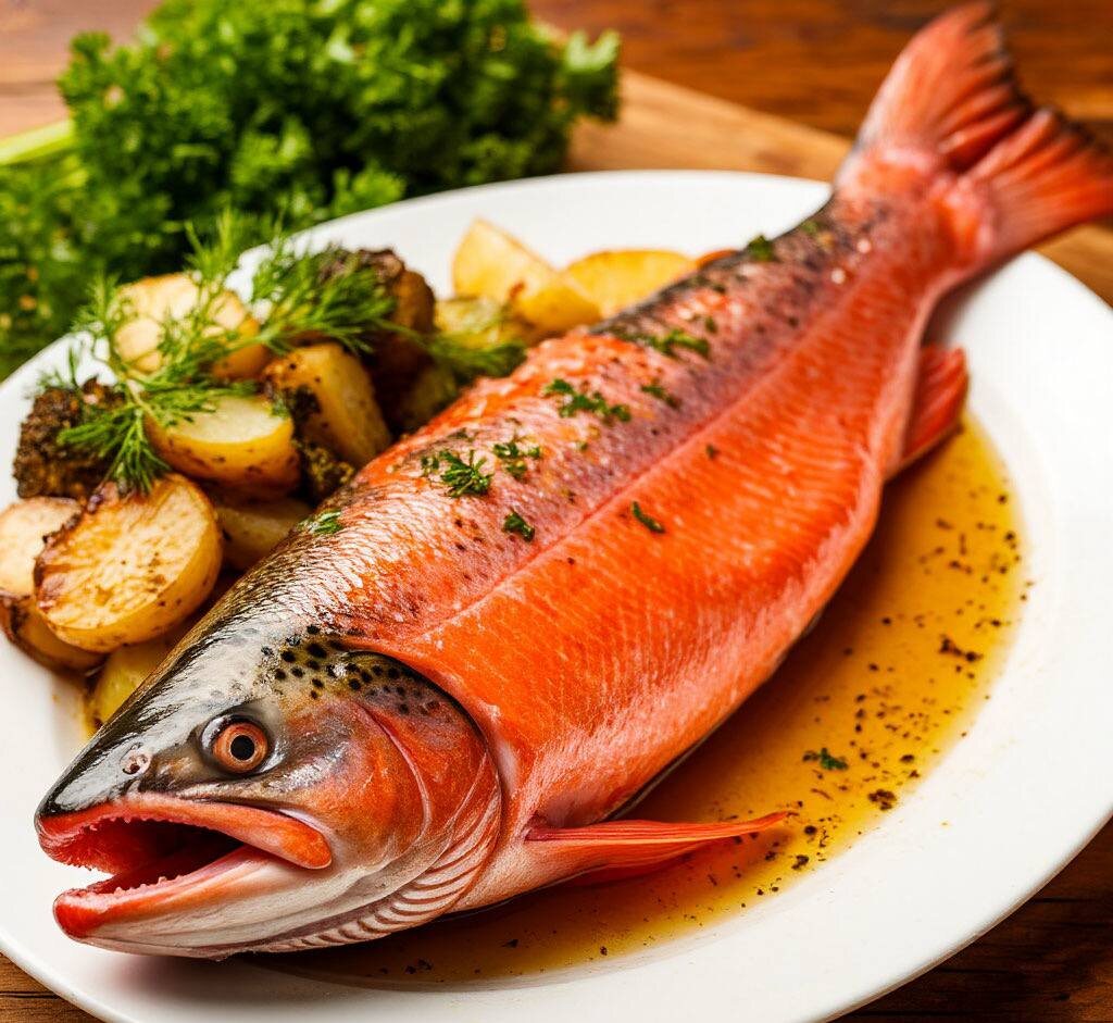 Горбуша, запечённая в духовке 🔪Состав: - Горбуша целая - 1 шт. - Лимон - 1 шт. - Чеснок - 1 зубчик - Петрушка - 1 пучок - Розмарин - 1 веточка - Соль, перец - по вкусу - Раст. масло - 50 мл. 📙Рецепт: 1. Разогрейте духовку до 160 °C. Форму для запекания или противень застелите фольгой. 2. Выпотрошите рыбу и извлеките жабры. Сделайте на боках параллельные надрезы. Посолите и поперчите внутри и снаружи. 3. Нарежьте лимон ломтиками, а чеснок крупно порубите. Распределите по противню вместе с петрушкой и розмарином. Сверху выложите горбушу. 4. Сбрызните рыбу столовой ложкой масла. Накройте вторым листом фольги и подверните края. Запекайте 25 минут. 5. Снимите верхний лист. Смажьте рыбу оставшимся маслом. Запекайте горбушу в фольге в духовке ещё около 15 минут до образования корочки.