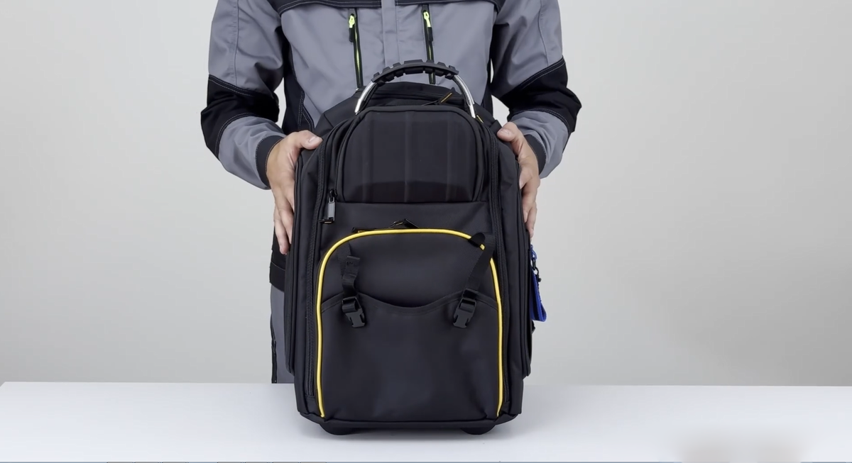 Рассмотрим два варианта, один из которых ― на колесах и с телескопической ручкой. Рюкзаки комфортны в носке за счет накладок на спинке, имеют стропы для грудной стяжки на бретелях. Обе модели выполнены из полиамидной ткани усиленного переплетения ― сохраняют презентабельный вид на протяжении всего срока службы. В рюкзаке для инструментов ZH 23006 за счет разнообразных секций легко упорядочить инструменты и обеспечить быстрый доступ к ним. Изделие подходит для хранения и транспортировки всего необходимого. Особенности изделия: Габариты: В рюкзаке удобно переносить большое количество изделий. Но знакома ситуация, когда нужно взять с собой тяжелые инструменты, и в результате рюкзак трудно носить на плечах? Подвергать спину чрезмерной нагрузке не приходится, когда есть рюкзак на колесах и с телескопической ручкой. Рюкзак ZH 23007, наполненный инструментами, можно катить, как чемодан, благодаря телескопической ручке и колесам. Другие особенности изделия: Габариты: