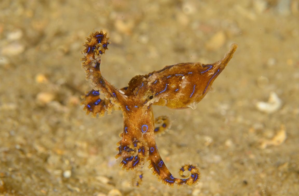 Осьминоги рода Hapalochlaena, известные как синекольчатые осьминоги, обладают одним из самых смертоносных веществ, известных науке. Тетродотоксин в их яде настолько сильный паралитик, что один укус этого головоногого моллюска размером с ладонь может убить человека. Но для осьминогов это всего лишь седативное средство – самцы используют его, чтобы подавить своих гораздо более крупных партнерш. Сексуальный каннибализм распространен среди головоногих моллюсков. Самки прекращают есть после откладывания яиц и посвящают остаток жизни заботе о своем развивающемся потомстве и его защите. Но до периода «родов» в меню есть самцы – они намного меньше самок, поэтому, когда они сближаются с самками время спаривания, чтобы ввести свои специализированные щупальца для ввода спермы, они уязвимы и становятся объектами для съедения. Однако, когда исследователи наблюдали за шестью парами синекольчатых осьминогов во время спаривания, самцы, всегда завершая передачу спермы оставались невредимыми … благодаря