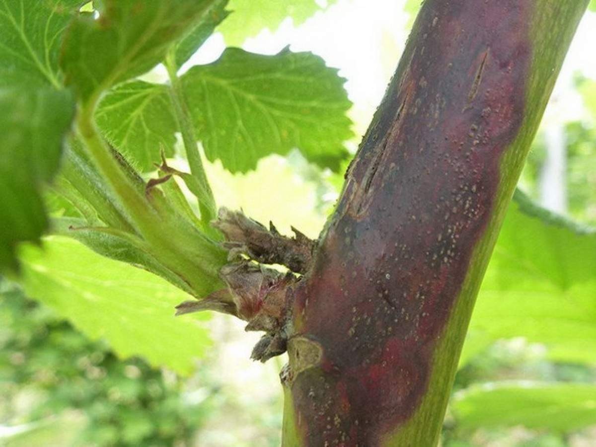 Выявить эту напасть не так сложно, если внимательно следить за состоянием кустарников. На начальной стадии опоясывающие пятна фиолетового цвета появляются внизу стеблей, затем поднимаются выше и приводят к гибели куста.