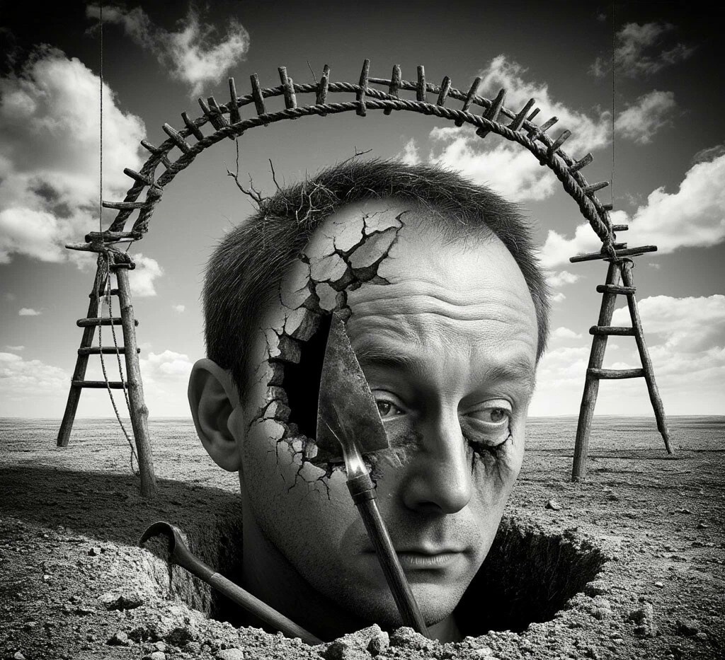 В один из таких прыжков что-то ударило мне в затылок. Еще прыжок. И снова удар. Я остановился и поднял руки. И там, в этой пустоте нащупал... веревку. Схватил ее двумя руками и дернул вниз. Держалась крепко. Стал тащить сильнее. Не отрывалась и не падала. Обнаружился второй конец. Да это же веревочная лестница! Собрав последние силы, я прыгнул, мертвой хваткой вцепившись. Чувствовал, что по рукам струиться кровь. Держался, дрыгал ногами. Но мне удалось подняться выше. Подвешенный в воздухе на собственных руках, я болтался из стороны в сторону с такой силой, что казалось она меня вышвырнет. И все равно держался. Внизу больше нет моего убежища. В стенах нет двери. Впереди только веревка, лестница из нее. И я лез. Кровь лилась по рукам на тело. Я почти слышал, как беззвучно она капает в холмик над когда-то моей ямой, струясь по ногам. И лез дальше... Пока не потерял сознание.
