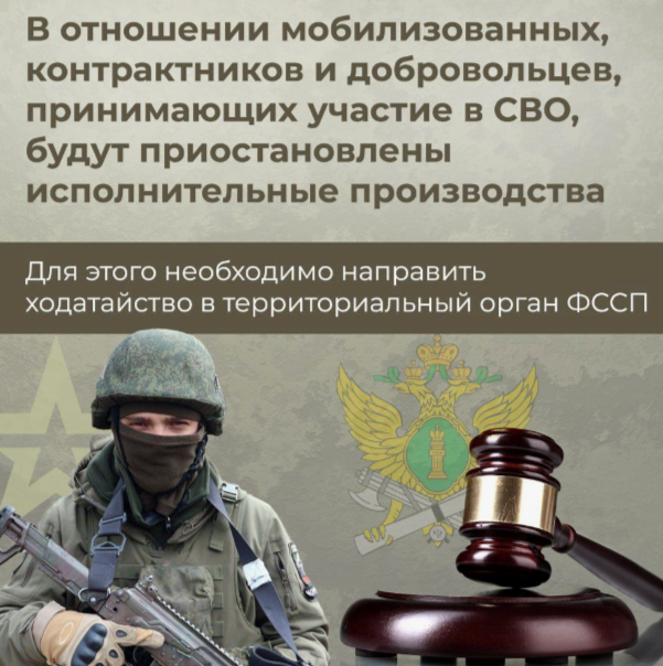 Участники СВО (специальной военной операции) имеют право на приостановление исполнительного производства в соответствии с Федеральным законом от 26.01.1996 № 14-ФЗ "О ветеранах" (в редакции от 2022 года) и Федеральным законом № 229-ФЗ "Об исполнительном производстве". ✅ Участие в СВО (подтверждается военным билетом, справкой из военкомата или командировочным удостоверением).