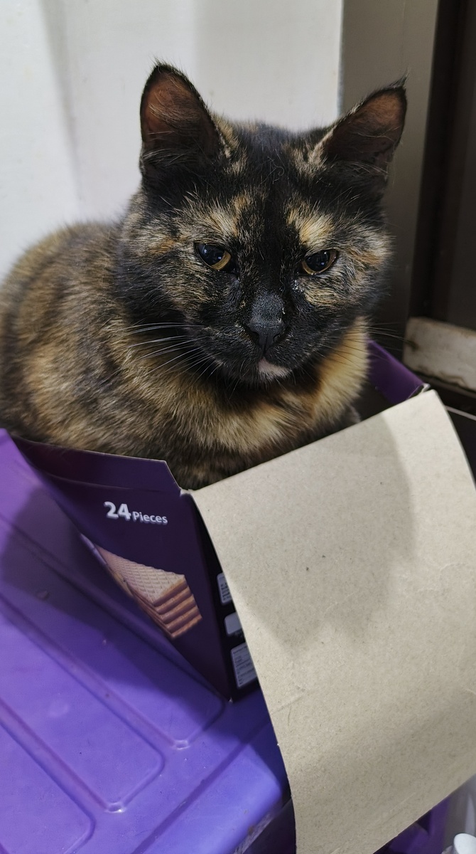 Вчера ночью сидела и работала. Одна из кошек (Амирка. это ей в прошлый раз стерилизацию делали) настойчиво пыталась уместиться в... маленьку коробочку от вафель. Вафли, кстати, "заслуженные" - их себе покупали бандиты, у которых я была в плену. И мне тоже их давали. Может, благодаря им и выжила. Вафлям и бармалеям, которые были не ИГИЛ, и с которыми еще можно было договариваться. В общем, купила себе, когда из Триполи домой ехали. А то я кофе с молоком и просто вареный кофе дую, а погрызть нечего. Короче, две кошки сразу ( но по очереди) Амирка и Черная еще когда вафли в коробке не закончились, начали проявлять к ней интерес. В итоге, смогла в нее впихнуться Амирка и так потом в ней до утра и спала. Коробка в длину сантиметров 15, в ширину около 10. Утром уже от коробочки одни дырочки, конечно, остались. Но главное - она в нее влезла! А мне надо как-то возвращаться к нормальному режиму дня. Сейчас работаю до 5 утра, просыпаюсь в 10-11, не высыпаюсь. Думаю, через несколько дней, након