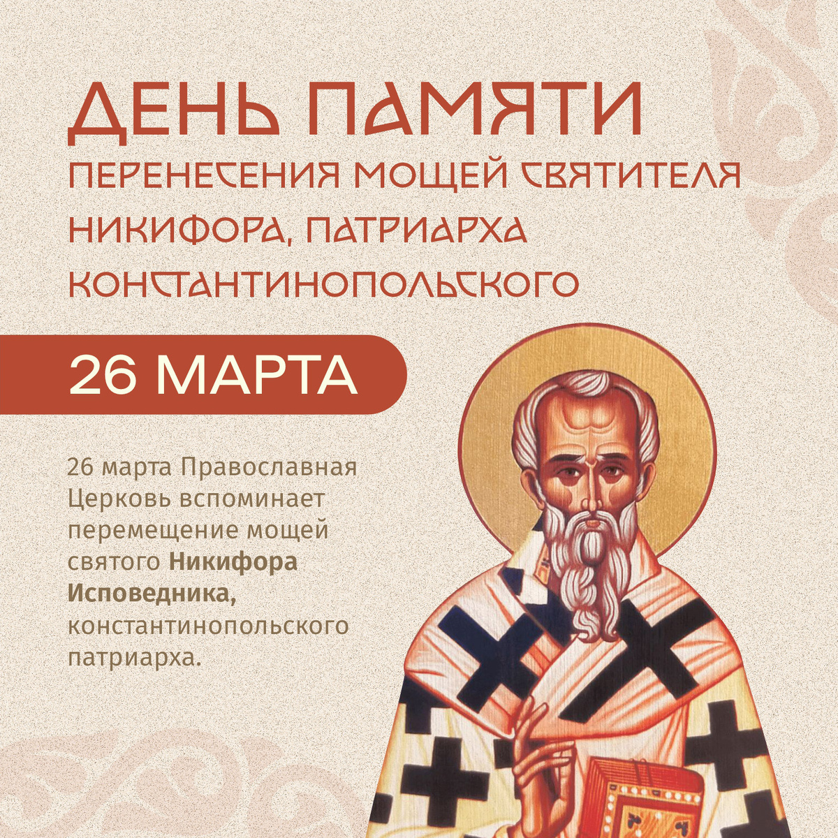 26 марта – перенесение мощей святителя Никифора, патриарха Константинопольского