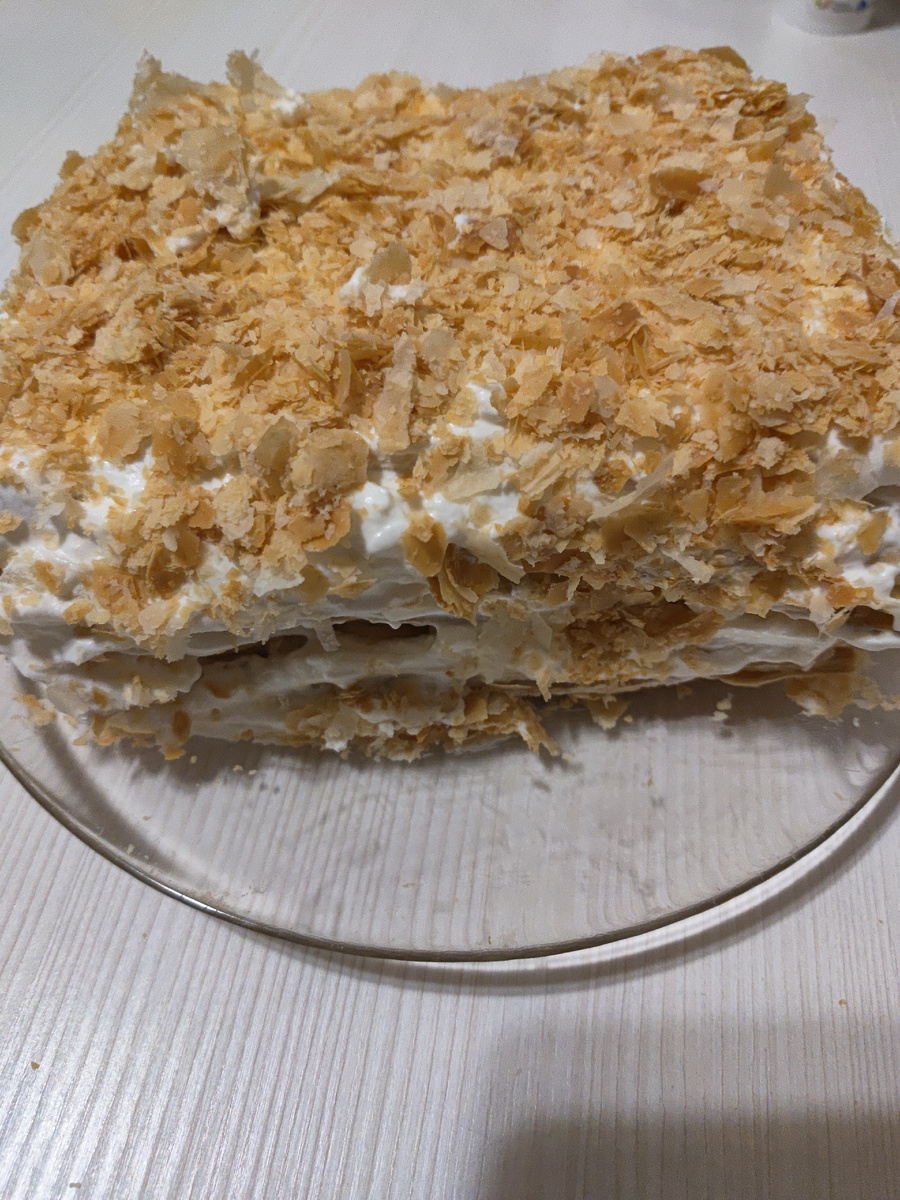 Добрый день! Если вы любите воздушные десерты на основе слоеного теста и не хотите долго стоять у плиты, попробуйте приготовить торт «Наполеон» из готового слоеного теста, который также называют «ленивым „Наполеоном‟». Моя семья очень любит "Наполеон", хоть мне и нельзя сладкого, готовлю для них 😁 Подготовьте все ингредиенты. Слоеное тесто слегка разморозьте и разрежьте на одинаковые прямоугольники. Разогрейте духовку до 200 градусов и запеките листы теста до румяности примерно 20 минут. Для крема. Взбить сливки до мягких пиков. Предварительно сливки хорошо остудить в холодильнике 3–4 часа. Как только венчик стал оставлять бороздки на сливках, нужно прекратить взбивать. Добавить к сливкам сахар и хорошо охлаждённый сыр. Включить миксер на малую скорость. Нужно, чтобы масса не взбивалась, а перемешивалась. После того как коржи остыли, разделите каждую часть теста на несколько частей, один корж оставляем для крошки. Берем наши кoржи собираем торт. Коржики хрупкие, особенно верхушки, не