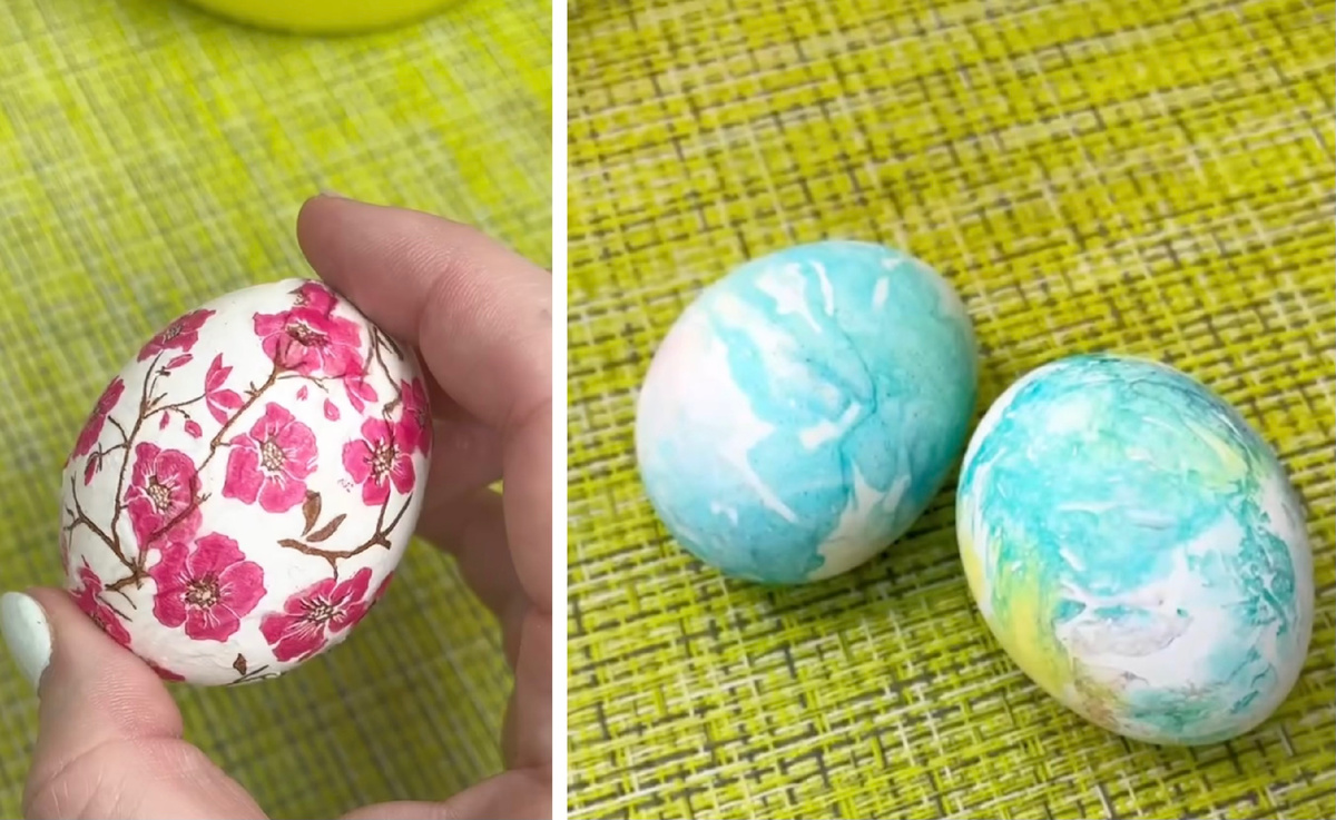 Если вы вообще не желаете задействовать магазинные красители, то второй способ с салфетками для вас! Он экологичный, так как используется для украшения белок яйца! Он служит своеобразным клеем. Делается все очень просто и быстро.