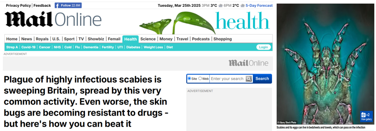 Издание Daily Mail сообщает, что Королевство охватывает эпидемия чесотки. В квартирах Лондона полно клопов, которые становятся устойчивыми к инсектицидам. Граждане страны жалуются, что это - «один из худших опытов в жизни». Паразиты заедают взрослых и детей. Британцы страдают от кровавой сыпи и выстраиваются в очереди к доктору – разумеется, те кто имеют медицинскую страховку или могут заплатить за приём. Чаще всего пациентам предлагают намазаться с ног до головы перметрином (ветеринарным средством от глистов для лошадей). Однако, несмотря на многократные курсы «целебного препарата», чесотка продолжает возвращаться. Угроза эпидемии растёт. В конце минувшего года Британская ассоциация дерматологов предупредила, что количество госпитализаций «необычно велико» и в три раза превышает средний показатель за пять лет. Инфицировано не менее 200 000 человек. Госслужбы проводят ликбез и учат «цивилизованных европейцев», что в случае заражения надо провести дезинсекцию жилья, и необходимо соблюда