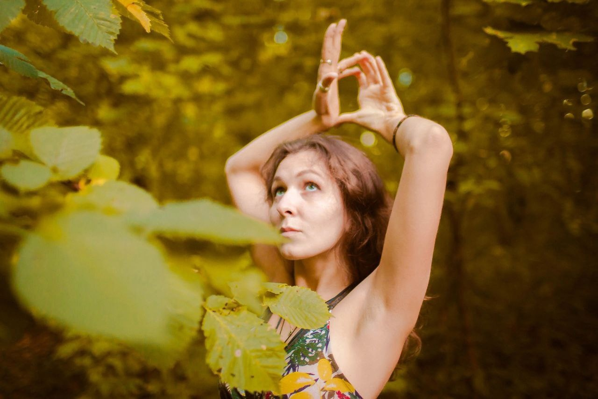 Внезапно она мелкими шажками сбежала с тропинки, немного покрутилась на месте и замерла, слегка согнув ноги в коленях, задрав голову и вытянув правую руку перед собой.