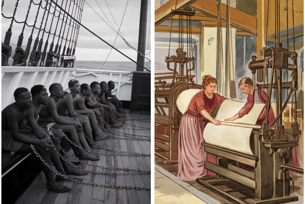 Принято считать, что отмена рабства в XIX веке стала итогом развития гуманистических идей и борьбы аболиционистов. Безусловно, их роль была значительна: общественные кампании, такие как движение Уильяма Уилберфорса в Британии и подпольная сеть «Подземная железная дорога» в США, создавали моральный климат, в котором рабство воспринималось как анахронизм. Однако ключевой причиной крушения системы стали экономические факторы — промышленная революция сделала рабский труд менее выгодным по сравнению с машинным производством. Какие же факторы лежали в основе этого процесса? 1. Промышленный переворот: когда машины вытеснили рабов К началу XIX века Британия, ещё не «мастерская мира», но уже лидер западной экономики, переживала бурную индустриализацию: - Текстильные фабрики Манчестера и Лидса производили ткани дешевле и быстрее, чем плантации Юга США, где применялся рабский труд. - Паровые машины снизили зависимость от мускульной силы. - Железные дороги и пароходы сократили потребность в гу