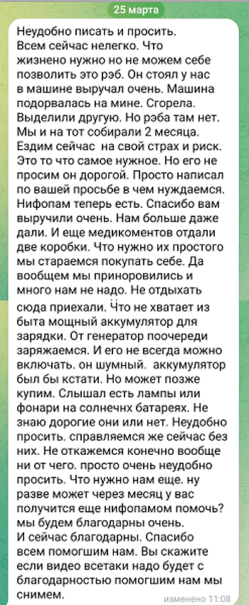 Хронология предыдущих событий. 👇 1. Я получила сообщение от ребят - ССЫЛКА 2. Нам удалось им помочь и Коля (мой знакомый военный волонтёр) повёз ребятам препарат, а после личной встречи попросил "не бросать их" - ССЫЛКА. 3. Не дозвонившись до Коли я задала вопрос ребятам - в чём они очень нуждаются. Они прислали ответ - ССЫЛКА Впрочем, размещу его здесь ещё раз и целиком (не разрезая): Наконец-то Коля появился в сети и я с ним пообщалась о ребятах... Не всё в интернет-пространство "вывалишь", чтобы не подставить ребят. Поэтому постараюсь максимально обходить стороной то, что возмущает. Но в сотрясении воздуха в принципе смысла нет, а значит пусть лучше будет дело, а не слова. Коля мне примерно то же самое сказал, а он ездит много, видит и знает немало. Как я писала - многое зависит от командиров и вышестоящих. Абстракцию в виде "всё у нас в стране плохо" оставим, так как конкретику я писать не буду, а додумывать "кто виноват" не нужно - можно ошибиться, но зато быть "в модном тренде