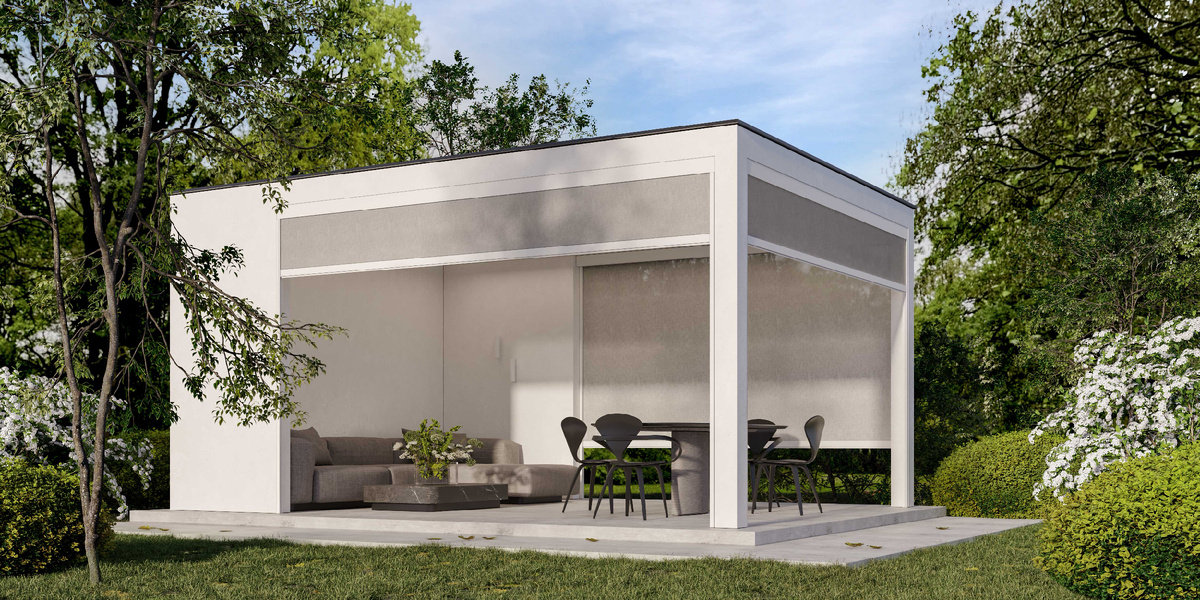 ✔ Чтобы беседка была комфортной в любую погоду, используйте тканевые солнцезащитные системы – они уберегут от палящего солнца летом и легкого дождя осенью. Вечером в беседке легко организовать настоящий уличный кинотеатр! Достаточно проектора и внешней солнцезащи
