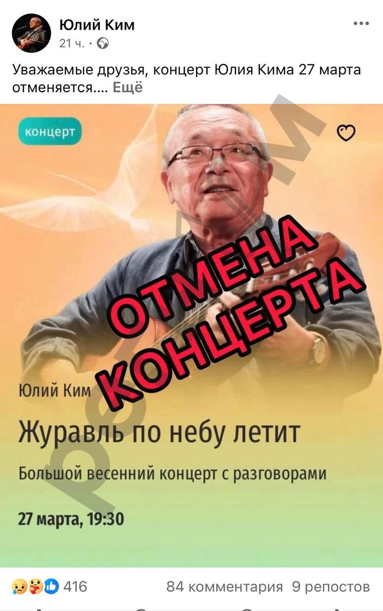 О том что концерт-выступление, запланированное на 25 марта, не состоится, сам Юлий Черсанович сообщил в своих соцсетях. Также отменили и выступление, запланированное в Москве на 27 марта.