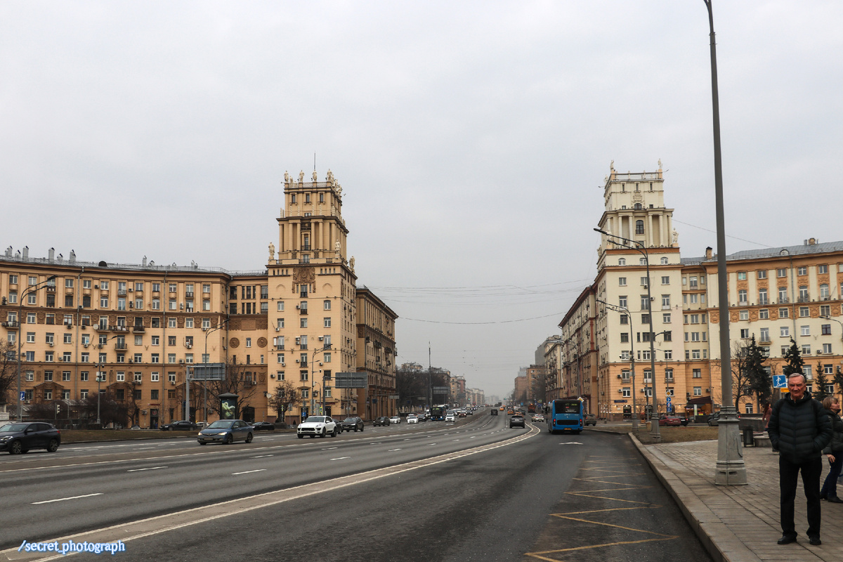 А если быть точным, то два дома, построенные полукругом, словно парадные ворота в Москву, стоящие там, где когда-то располагалась Калужская застава и одноименная площадь, в шестидесятые годы переименованная в площадь Гагарина. Дом справа, состоящий из двух частей (№37, корпус 1 и №37А), строился в два этапа, в 1940-1941 годах по проекту архитектора Михаила Григорьевича Бархина и в 1946-1953-м ленинградскими архитекторами Евгением Адольфовичем Левинсоном и Иваном Александровичем Фоминым соответственно, как дом для сотрудников НКВД, а позднее МВД. И левый дом (№30)... Его должны были построить гораздо раньше, чем он появился в действительности. Проект, первоначально созданный теми же Фоминым и Левинсоном, был готов уже в 1930-х, но сначала строительство затянулось, а затем окончить постройку помешала война. Рассказывают, что к моменту начала Великой Отечественной успели возвести всего четыре этажа. Завершающие работы над его возведением велись уже в 1946-1950 годах по проекту, который по