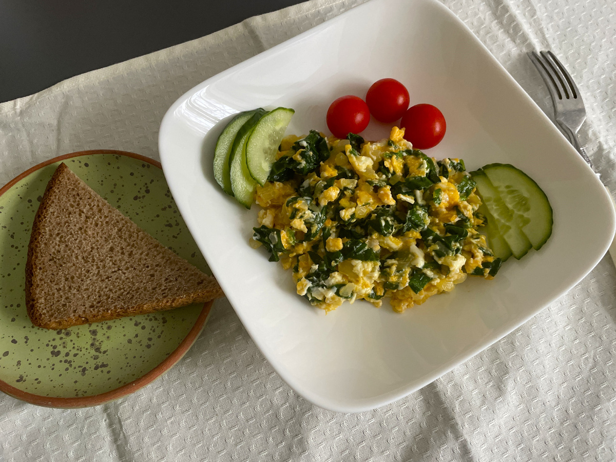 Добрый день дорогие друзья! Весна, а это значит, что хочется все больше свежей зелени. Как пишут китайцы, каждому овощу свое время года. Без зелени я в принципе жить не могу вообще, но зимой как-то естся больше квашеная капуста, моченые яблоки, свекла, морковь. Шпинат. Про его пользу знала давно и не раз пыталась выращивать его на даче. Но зачастую у меня весь шпинат уходил в цвет и, увы, ничего не получалось. В магазинах до появления супермаркетов я его не встречала. А сейчас прямо раздолье, покупай что хочешь, особенно на московском рынке. Польза шпината заключается в содержании в нем витаминов А, С, К, фолиевой кислоты, железа и магния. Но, все следует употреблять в пищу если это хочется, а не потому что полезно и надо. Как я готовлю шпинат. Мне понадобится пучок шпината, 4-5 куриных яиц, 1 луковица, топленое масло и соль. Промываю и обсушиваю шпинат. Мелко нарезаю лук. На сковороде разогреваю кусочек топленого масла. Отправляю в сковороду репчатый лук и обжариваю его 2-3 минуты. Сл