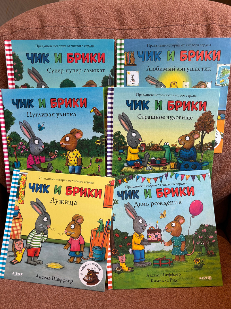 ⭐️ (оценка 1 из 5) О, эти знакомые, наверное, всем, полосатые корешки! По советам других мам, купили все доступные на тот момент книги и больше покупать не будем. Почему они не нравятся мне: В общем, Шеффлер гениальный иллюстратор, но целевая аудитория мне не понятна. У Шеффлера есть более удачные вещи, которые я рекомендую к покупке, но точно не эти книги. По крайней мере лет до 3 они не принесут никакой пользы.