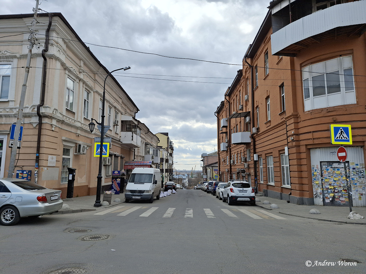 Весна продолжает надвигаться на наш город, но погода пока не совсем устойчивая – недавно прошли холодные дожди, сейчас период относительного тепла и облачности, а впереди прогнозы снова рисуют дожди. Не имея возможности съездить куда-то далеко, я понемногу брожу по городу. На днях прошелся по «старому центру» в районе Центрального рынка и отметил для себя, что улицы и дома на них меняются в лучшую сторону. Хотя еще предостаточно домов требующих ремонта, в общий пейзаж города они отлично вписаны. Переулок Соборный, вид от Центрального рынка в сторону Набережной. Видны портовые краны на левом берегу Дона Переулок Семашко, вид в сторону Набережной. Виден ТЦ Мегамаг на левом берегу Старинный дом на улице Ульяновской – немного подкрасить и будет красавчик! Покровский старообрядческий собор на Ульяновской. Построен на средства купца Панина в 1913 году Дом купца Панина рядом со старообрядческим храмом Кованые чугунные опоры балкона в жилом доме на Ульяновской Дверь в подъезд того же дома Пере